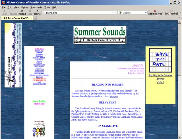 The site features the popular, weekly news column, Artbits, plus featured artists Corliss Blakely, Janet Bonneau, Michael Domina, Natalie LaRocque-Bouchard, and Valerie Ugro, featured music from 8-0-8-4, Banjo Dan & the Midnight Plowboys, Will Patton, Ben Patton, Nobby Reed, to Southbound, wide ranging resources for artists and audiences, and the expected donation barrel.
